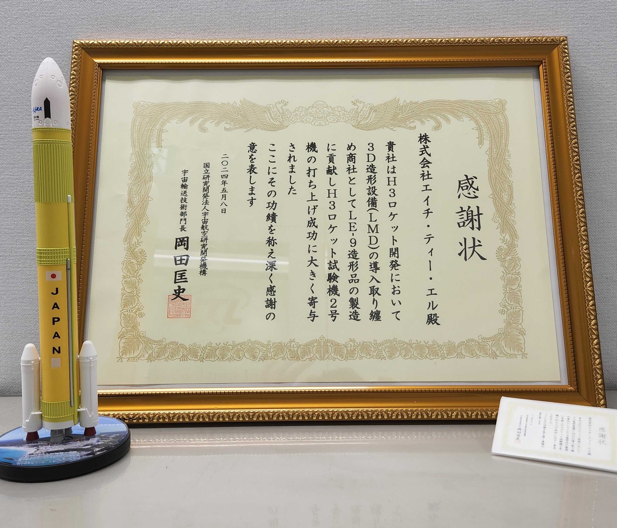 装置導入後、JAXA様、及び三菱重工業様にて、H3ロケットの開発を進められ、遂に、2024年2月に打ち上げに成功しました。その成功に対して、当社が納入した本装置によるエンジン部品の開発・製造が軽量化。コスト削減等にも大きく貢献したとのご評価を頂き、この度、JAXA様から感謝状が贈られることとなり、5月8日に表彰式が行われました。